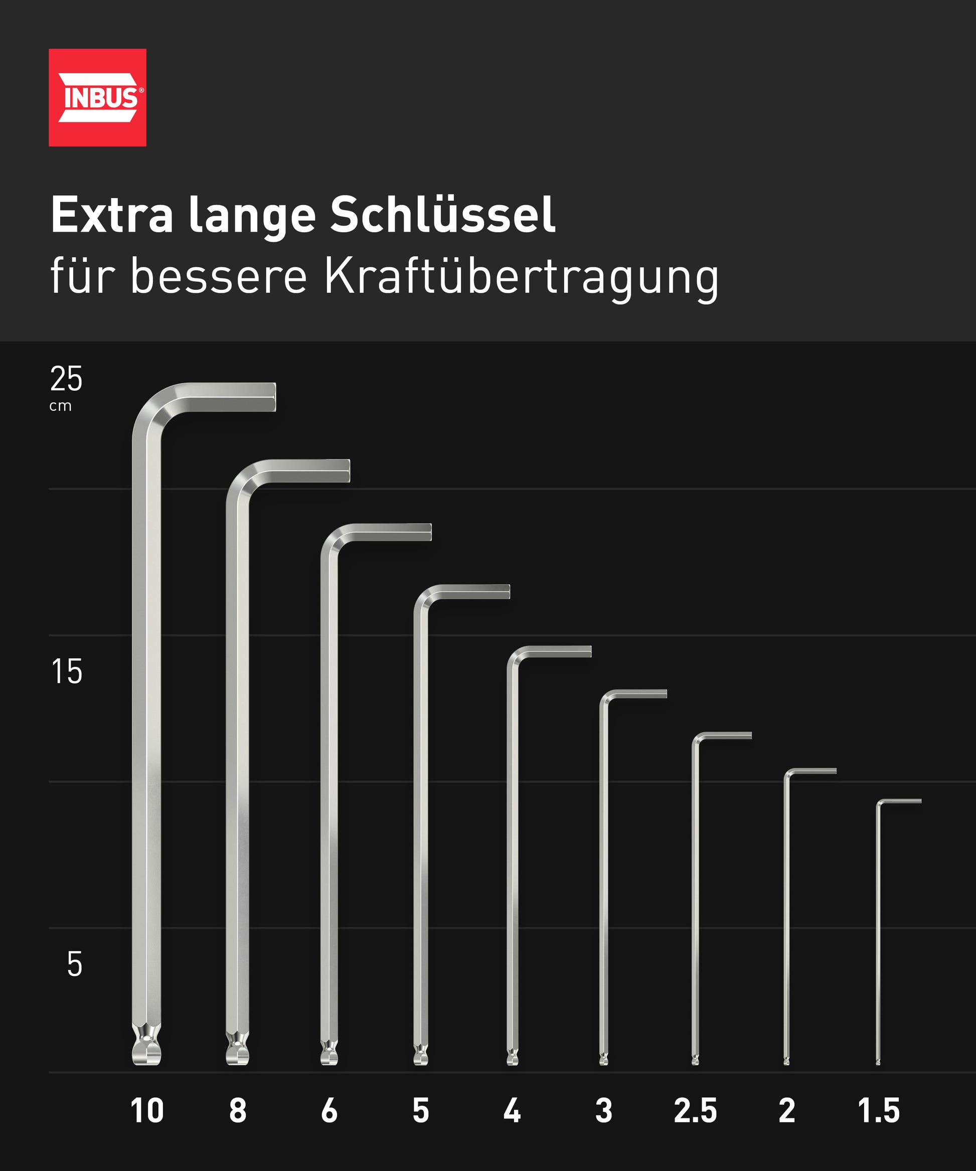 Inhalt: 9 × INBUS L-Serie Winkelschraubendreher: 1.5mm | 2mm | 2.5mm | 3mm | 4mm | 5mm | 6mm | 8mm | 10mm